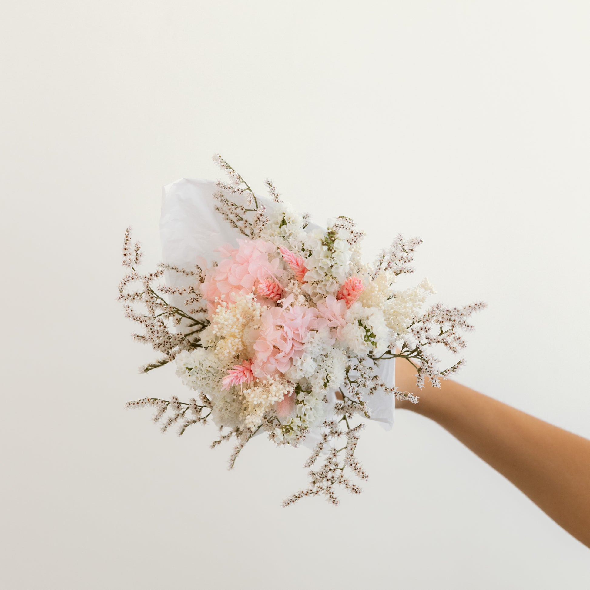 Bunch of dried and preserved flowers in shades of pink, white, dry green and eucalyptus.